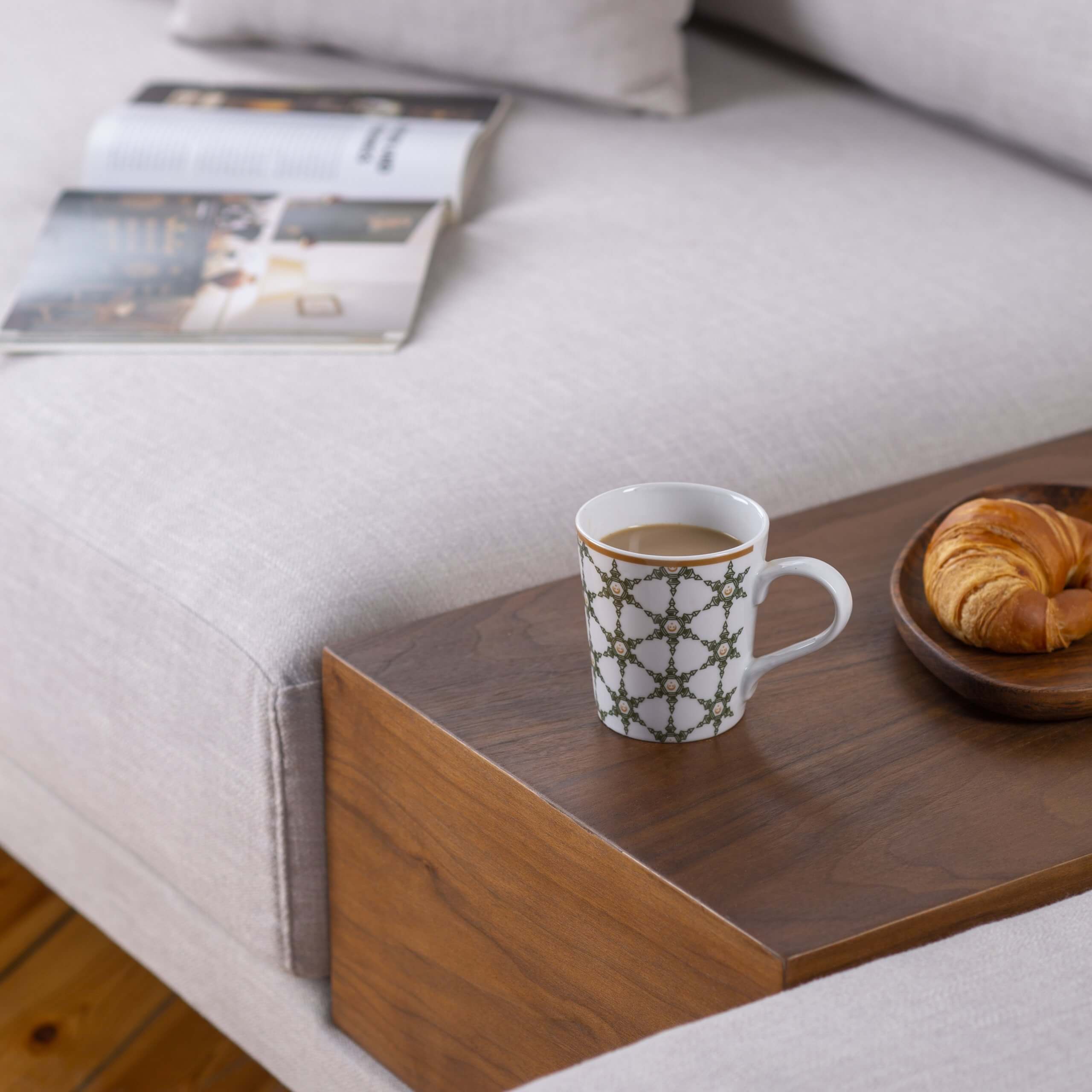 Clean lines and an embedded walnut wood tray make this L-shaped sofa feel like a floating island. Sink in with a book and a warm cup of tea into your favorite corner in the room.